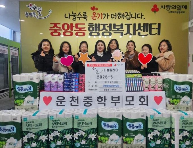 백경희 중앙동장은 “지역사회를 위해 이웃사랑을 실천해 주신 운천중학교 학부모회에 깊이 감사드린다”며 “기탁해 주신 물품은 정성 어린 마음을 담아 도움이 필요한 어르신들께 소중히 전달하겠다”고 밝혔다.