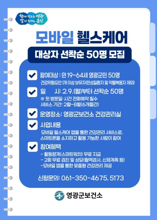 (포탈뉴스통신) 영광군보건소는 오는 2월 9일부터 모바일헬스케어 사업 1기 참여자 50명을 선착순 모집한다고 밝혔다.