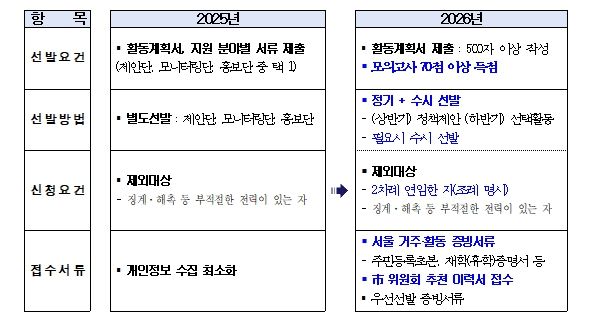활동 방식도 청년들의 의사에 따른 자율적 참여를 기반으로 재설계했다. 기존에는 정책제안단, 모니터링단, 홍보단 등 역할별로 구분해 선발했으나, 올해부터는 역할 구분 없이 선발한다. 상반기에는 모든 참여자가 정책 제안 활동에 공통으로 참여하고, 하반기에 참여자가 희망하는 활동을 선택하도록 참여 방식을 개편했다.