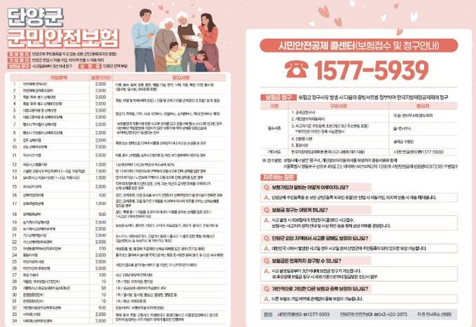 군민안전보험은 단양군에 주민등록을 두고 있는 모든 군민과 등록외국인을 대상으로, 일상생활 중 예상치 못한 재난·사고·범죄 피해 발생 시 보험금을 지급하는 제도다.