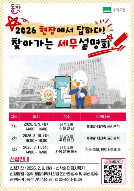 (포탈뉴스통신) 동작구가 재개발·재건축이 활발히 진행되는 구 특성을 반영해 ‘2026 현장에서 답하다! 찾아가는 세무설명회’를 개최한다고 밝혔다.