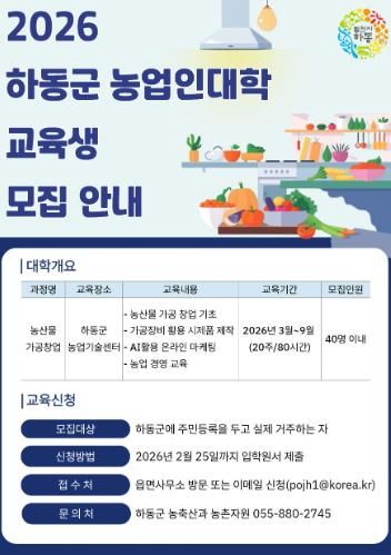 (포탈뉴스통신) 하동군은 농산물 가공 및 창업을 희망하는 군민을 대상으로 전문 인력을 육성하기 위해 ‘2026년 하동군농업인대학’ 교육생을 오는 2월 25일까지 모집한다고 밝혔다.