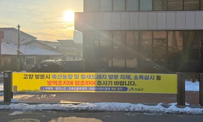 (포탈뉴스통신) 임실군은 설 명절을 앞두고 조류인플루엔자(AI), 아프리카돼지열병(ASF) 등 가축질병의 확산을 예방하기 위해 고향 방문시 축산농장 및 철새도래지 방문 자제 협조를 당부하는 홍보 현수막을 12개 읍·면 및 주요 도로변 게시판 20개소에 설치했다.