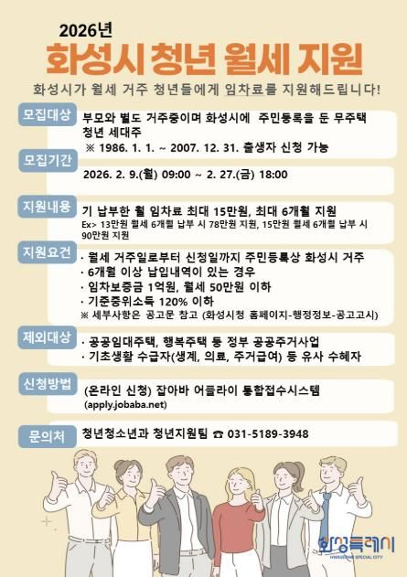 (포탈뉴스통신) 화성특례시가 청년들의 주거비 부담을 덜고 안정적인 주거 생활을 지원하기 위해 2월 9일부터 2월 27일까지‘청년 월세 지원 사업’ 신청자를 모집한다고 밝혔다.
