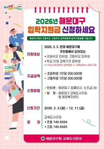 해운대구 관계자는 “입학지원금이 학부모의 경제적 부담을 덜고, 아이들이 새로운 출발을 준비하는 데 실질적인 도움이 되기를 바란다”며 “앞으로도 학생 중심의 교육 지원 정책을 지속적으로 추진해 나가겠다”고 말했다.