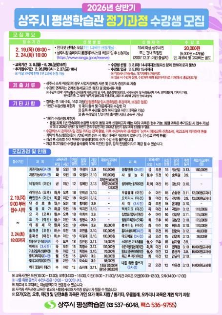(포탈뉴스통신) 상주시 평생학습원은 시민들의 자기 계발과 평생교육 기회 확대를 위하여 2026년 상반기 평생학습관 정기과정 수강생을 모집한다.