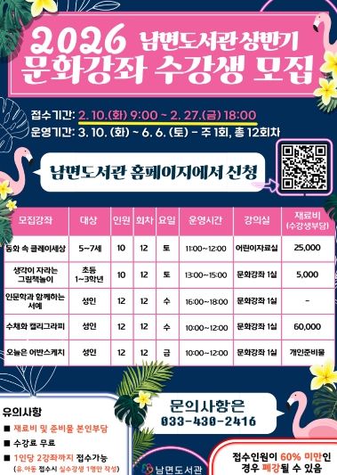 (포탈뉴스통신) 홍천군립도서관은 2월 10일부터 2월 27일까지 2026년 상반기 독서문화강좌 수강생을 모집한다.