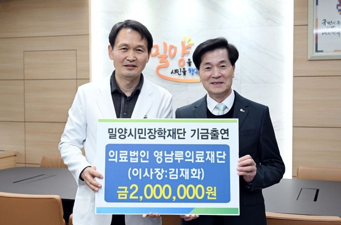 (포탈뉴스통신) (재)밀양시민장학재단(이사장 안병구)은 10일 의료법인 영남루의료재단(이사장 김재화)과 대한숙박업중앙회 밀양시지부(지부장 조희선)에서 지역 교육 발전을 위한 장학기금으로 각각 200만원과 300만원을 기탁했다고 밝혔다.