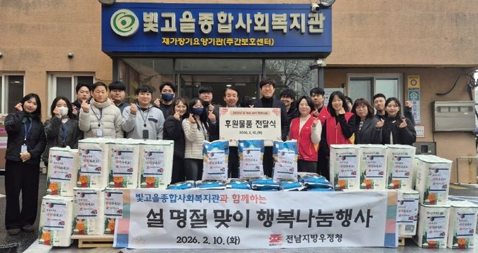 이날 전남지방우정청 행복나눔봉사단은 급식소를 찾은 어르신들에게 떡국과 명절 음식을 정성껏 배식하고, 식당 정돈 등 봉사활동을 진행했다. 또한 250만 원 상당의 명절 특식 지원과 후원 물품을 전달하며 온정을 나눴다.