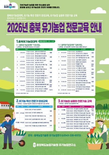 (포탈뉴스통신) 충북농업기술원은 유기농업 전문인력양성을 위해 ‘2026년 충북유기농업대학’ 교육생을 2월 11일부터 27일까지 모집한다. 모집 대상은 충북 지역에 거주하며 유기농업 실천을 희망하는 농업인으로, 기초과정과 심화과정에서 각각 50명을 선발할 계획이다.