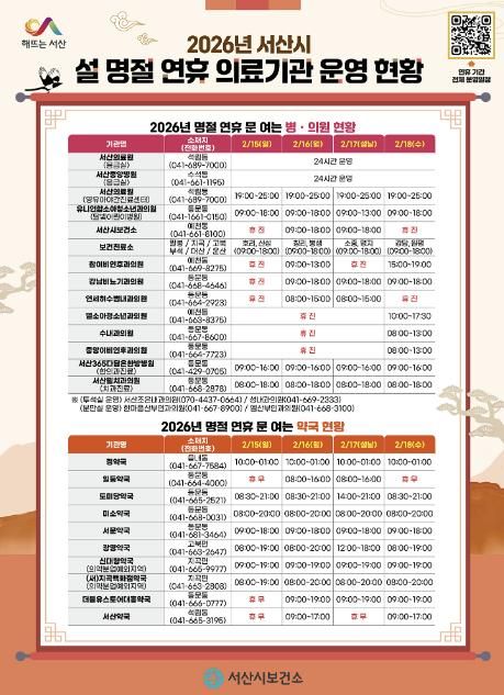 한편, 설 연휴 기간 문 여는 의료기관에 대한 정보는 서산시보건소 누리집, 응급의료정보센터, ‘응급똑똑’ 모바일 앱 등에서 확인할 수 있다.