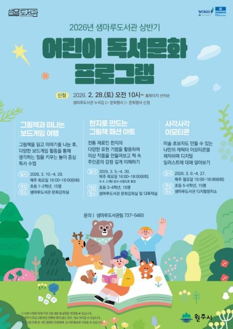 (포탈뉴스통신) 원주시 샘마루도서관은 오는 3월과 4월, 관내 어린이를 대상으로 ‘상반기 어린이 독서문화 프로그램’을 운영한다.