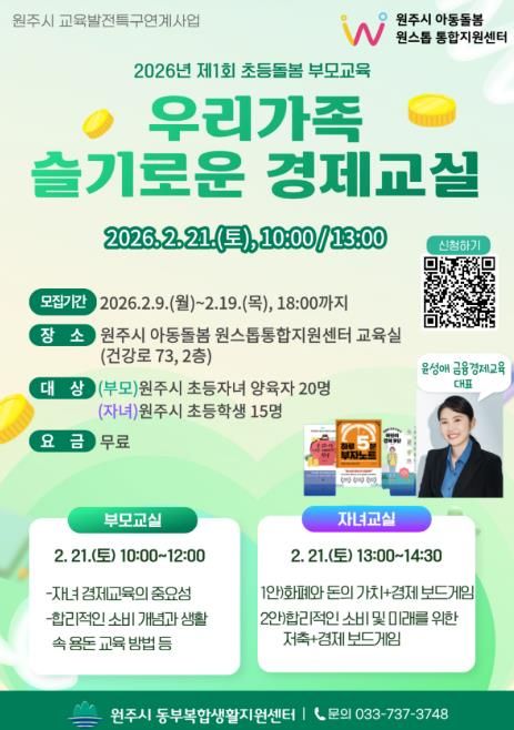 (포탈뉴스통신) 원주시 아동돌봄 원스톱통합지원센터는 2월 21일 초등생 가족을 위한 무료 경제 교육인'우리 가족 슬기로운 경제 교실'을 운영한다.