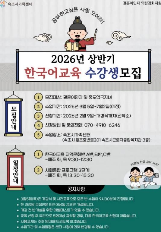 (포탈뉴스통신) 속초시가족센터가 속초시에 거주하는 결혼이민자의 지역사회 정착과 자립을 돕기 위해 상반기 한국어 교육과 운전면허 취득 지원사업 참여자를 모집한다.