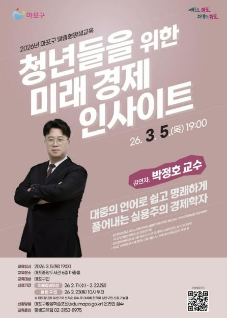 (포탈뉴스통신) 마포구는 대학생과 청년의 건전한 경제 가치관 확립과 자립 역량 강화를 위해 3월 5일 오후 7시 마포중앙도서관 마중홀에서 ‘청년들을 위한 미래 경제 인사이트 특강’을 개최한다.
