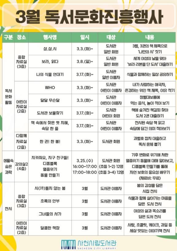 (포탈뉴스통신) 사천시립도서관은 2026년 3월을 맞아 시민들의 일상에 따스한 봄기운과 문학적 온기를 전하기 위한 ‘3월 독서문화진흥행사’를 운영한다고 11일 밝혔다.