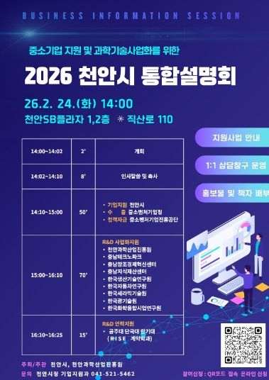 (포탈뉴스통신) 천안시는 오는 24일 천안과학산업진흥원과 함께 천안SB플라자에서 ‘중소기업 지원 및 과학기술사업화를 위한 2026 천안시 통합설명회’를 개최한다고 11일 밝혔다.