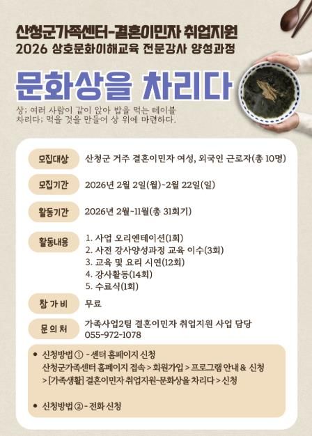 산청군가족센터 관계자는 “기존 사업 참여자들이 이번 양성과정을 통해 자신의 소중한 경험을 전문적인 직업 역량으로 전환하고, 지역 내 상호문화 이해 확산의 주역이 되길 기대한다”며 “앞으로도 결혼이민자들이 지역사회의 핵심 인재로 성장할 수 있도록 다양한 기회를 제공하겠다”고 말했다.