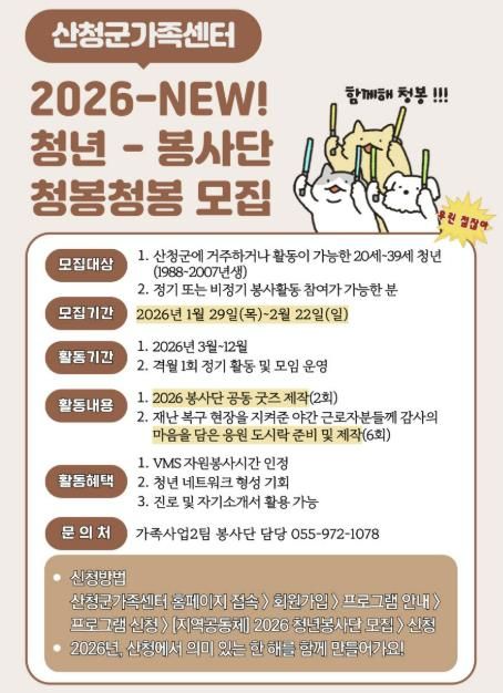 (포탈뉴스통신) 산청군가족센터는 2월 22일까지 가족봉사단-청년 대상 봉사단 '청봉청봉'을 모집한다고 11일 밝혔다.