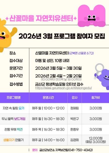 (포탈뉴스통신) 금산군은 지역 주민의 건강 증진과 여가 활성화를 위해 2월 20일까지 산꽃마을 자연치유센터 2026년 3월 프로그램 참여자를 프로그램별로 8명에서 12명까지 총 40여 명 규모로 모집한다.