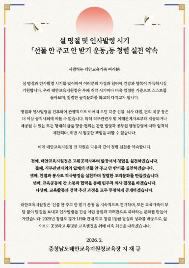 특히 태안교육지원청은 ‘선물 안 주고 안 받기 운동’을 지속적으로 추진하여 명절이나 인사 시기에 오가는 선물·식사 대접·편의 제공 등의 관행을 완전히 근절할 방침이다. 대신 진심 어린 응원과 격려로 서로를 축하하며, 건전하고 민주적인 조직문화를 만들어 가고 있다.