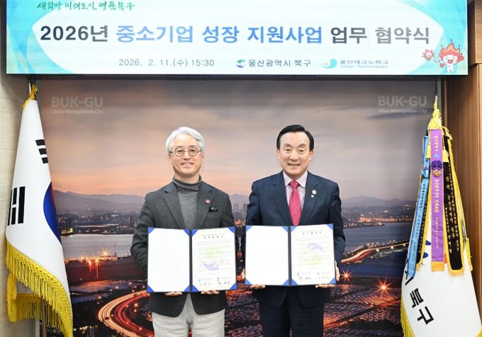 (포탈뉴스통신) 울산 북구는 11일 구청장실에서 울산테크노파크와 2026년 중소기업 성장 지원사업 업무협약을 체결했다.