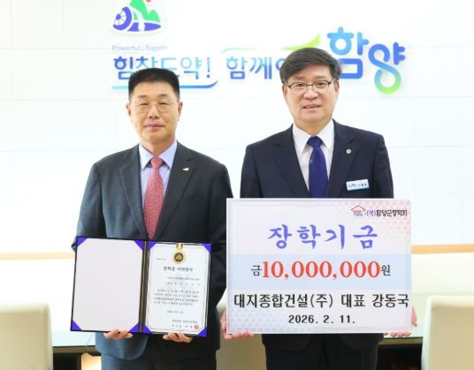 (포탈뉴스통신) (재)함양군장학회는 2월 11일 대지종합건설(주) 강동국 대표가 함양군 지역 학생들을 위해 장학금 1,000만 원을 기탁했다고 밝혔다.