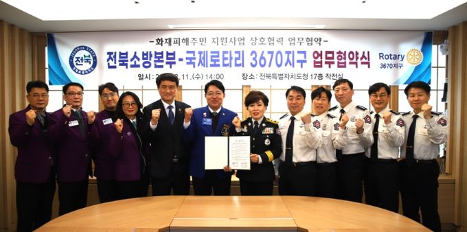 (포탈뉴스통신) 전북특별자치도소방본부는 11일 국제로타리 3670지구(총재 김성희)와 화재피해주민 지원사업의 원활한 추진을 위한 상호협력 업무협약을 체결했다고 밝혔다.