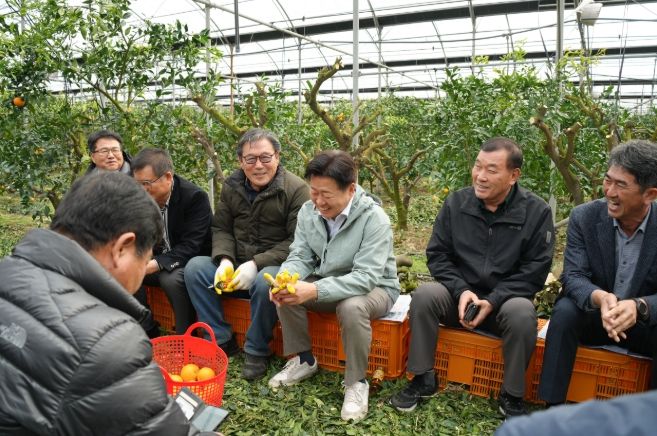 오영훈 지사는 11일 제주시 아라동 소재 한라봉 재배 농가를 방문해 수확 현장을 둘러보고 만감류 재배 농가들과 간담회를 열어 현장 애로사항에 귀 기울였다.