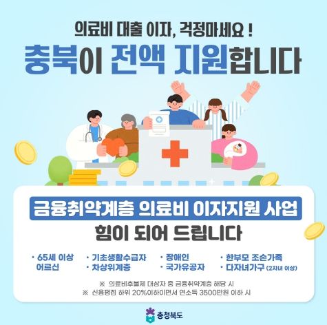 (포탈뉴스통신) 충북도는 의료 사각지대 해소를 위해 ‘금융취약계층 의료비 이자 지원사업’을 2월 11일부터 시행한다.