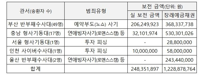 특히, 부산청 반부패수사대에서는 금융회사 28개 대상 484개 계좌를 분석하고, 가상자산, 부동산 보유 명세를 확인하여 부동산 · 자동차 등 5억 7,460만 원(장래예금채권 포함)을 보전 신청했고, 서울청 형사기동대에서는 송환자와 같은 범죄조직에 소속되어 국내에서 인출책으로 활동한 공범 2명까지 추적하여 위 보전 금액과 별도로 737만 원(장래예금채권 포함)을 추가 보전했다.