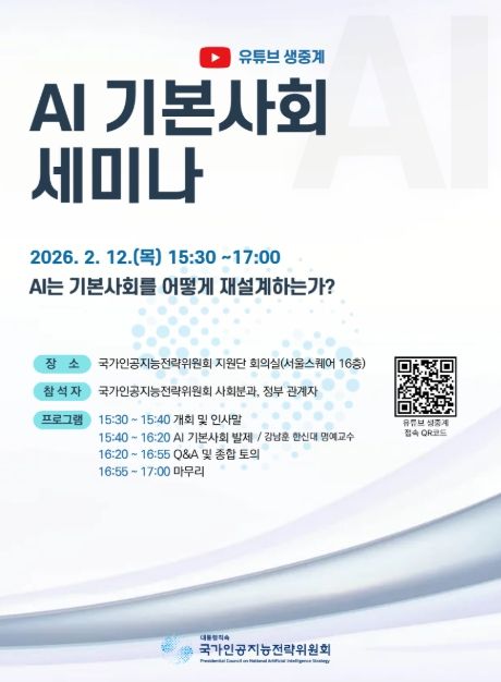 (포탈뉴스통신) 국가인공지능전략위원회는 2월 12일 오후 3시 30분부터 AI 기본사회 세미나를 개최한다. 이번 세미나는 AI 기술 확산이 노동ㆍ복지ㆍ분배ㆍ사회안전망 등 경제ㆍ사회 정책 전반에 미치는 영향을 종합적으로 살펴보고, AI 시대에 부합하는 기본사회 제도 설계 방향에 대한 시사점을 도출하기 위해 마련됐다. 특히 AI 기술의 확산에 따라 부와 생산수단이 특정 주체에 집중됨과 동시에 고용ㆍ소득 양극화를 포함한 구조적 변화가 예상되는 상황에서, 기본사회 정책이 어떤 역할과 방향성을 갖고 추진되어야 하는지에 대한 심도 있는 논의가 진행될 예정이다.