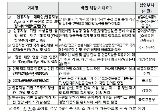 인공지능 민생 10대 과제(프로젝트)'는 국민 효능감이 높은 분야를 중심으로, 국민이 일상에서 인공지능을 체감할 수 있는 서비스를 빠르게 도입하여 인공지능 혁신의 혜택을 확산하기 위한 과제(프로젝트)이다. 공모 신청을 위한 구체적 지원 내용과 선정 절차 등 상세 내용은 과기정통부, 정보통신산업진흥원에서 확인할 수 있다.