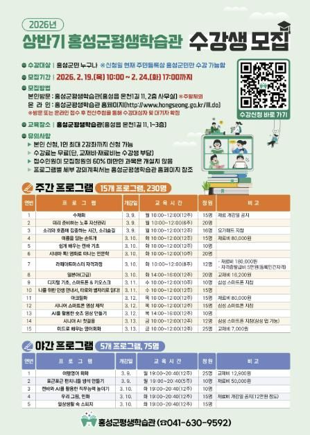 이번 상반기 프로그램은 인문교양, 문화예술, 직업능력 등 4개 분야, 총 77개 강좌에서 1,125명의 수강생을 모집해 운영할 예정이다. 접수는 2월 19일 오전 10시부터 2월 24일 오후 5시까지 진행되며, 홍성군평생학습관(홍성읍 온천1길 11)과 신도시평생학습관(홍북읍 홍학로 50) 방문 접수 또는 홍성군평생학습관 홈페이지를 통한 온라인 접수가 가능하다.