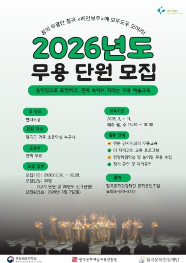 (포탈뉴스통신) (재)칠곡문화관광재단(이사장 김재욱)은 2025 꿈의 무용단, ‘칠곡’ '레인보우' 단원을 모집한다.
