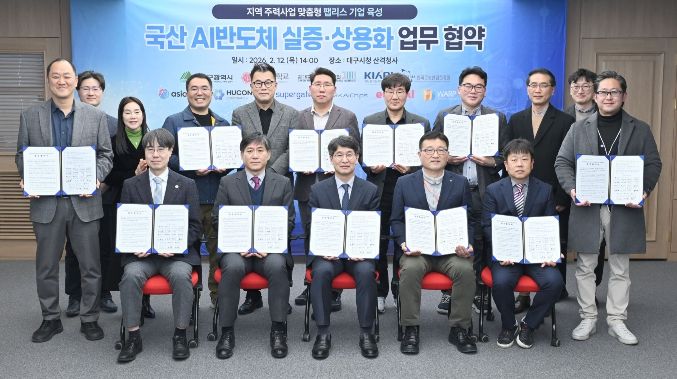 대구시는 2월 12일 시청 산격청사에서 대학, 공공기관, 팹리스 기업과 함께 ‘국산 AI 반도체의 실증 및 상용화 협력을 위한 업무협약’을 체결했다.