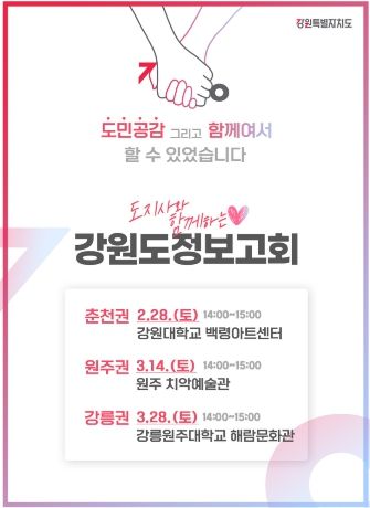 (포탈뉴스통신) 강원특별자치도지사는 2026년도 도정운영방향에 부합하는 도민 중심 공감행정을 실현하기 위해'“도지사와 함께하는”♥ 강원도정보고회'를 개최한다고 밝혔다.