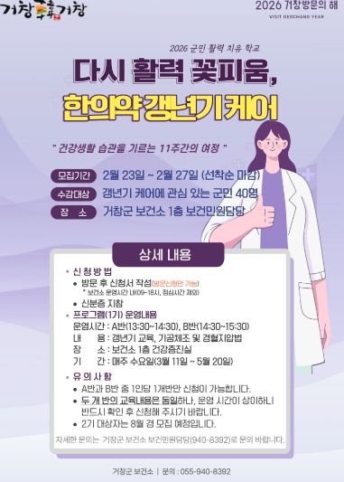 거창군 관계자는 “갱년기는 제2의 인생을 준비하는 중요한 시기인 만큼, 비약물적이고 안전한 한의약 건강법을 통해 주민들이 갱년기를 활기차고 건강하게 극복할 수 있도록 최선을 다하겠다”고 말했다.