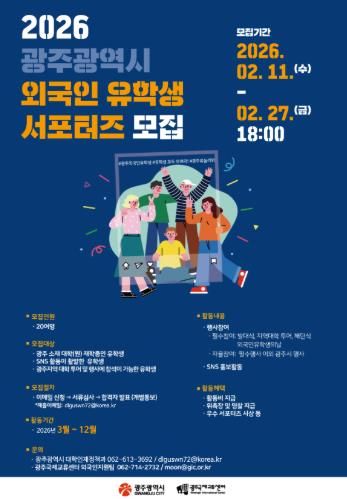 (포탈뉴스통신) 광주광역시는 광주의 매력과 지역대학 정보를 세계에 알릴 ‘제3기 외국인 유학생 서포터즈’ 20명을 오는 27일까지 모집한다.