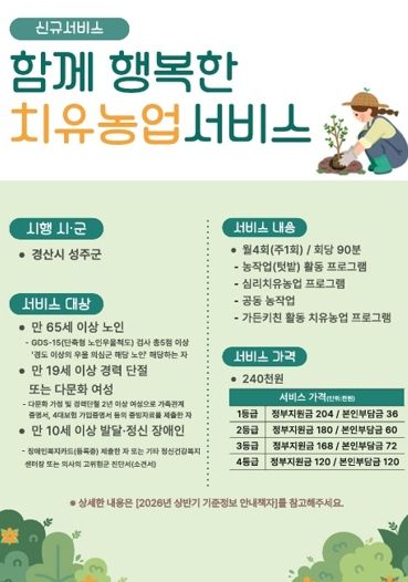 (포탈뉴스통신) 경상북도농업기술원은 2026년부터 치유농업을 활용한 *지역사회서비스를 본격적으로 추진, 공공형 치유농업을 확산해 지역 주민 삶의 질 향상과 지속 가능한 치유 서비스 제공 체계를 마련한다.