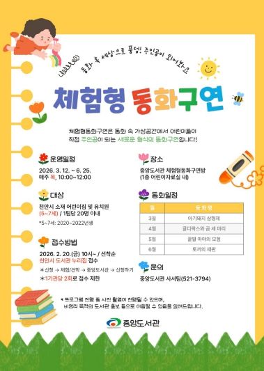 [ 천안시 중앙도서관은 오는 3~ 6월 ‘체험형 동화구연’ 프로그램을 운영한다고 19일 밝혔다.