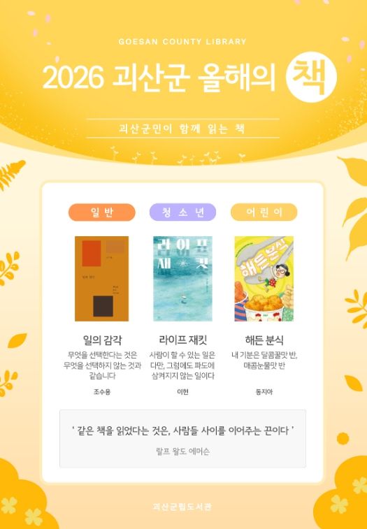 (포탈뉴스통신) 충북 괴산군립도서관이 2026년 괴산군 올해의 책으로 일반, 청소년, 아동 분야 각 1권씩 총 3권을 최종 선정했다고 20일 밝혔다.