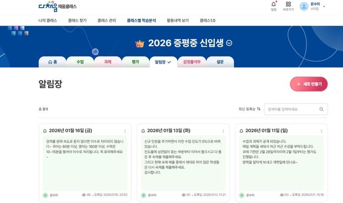 예비 신입생들은 '2026 증평중 신입생' 클래스에 참여해 국어‧영어‧수학 중심의 수업을 수강하고 온라인 과제를 수행하며, 중학교 디지털 기반 수업 방식에 사전 적응하고 있다.