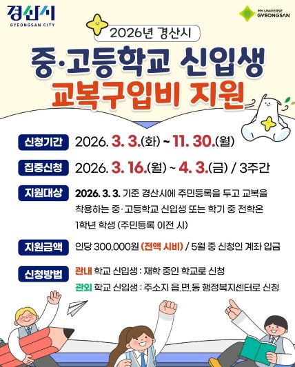 조현일 경산시장은 “새 학기를 준비하는 학생들과 학부모님들께 이번 교복구입비 지원 제도가 도움이 되길 바란다”며, “입학을 앞둔 학생들이 설렘 속에서 학교생활을 잘 시작하길 응원한다”고 말했다.