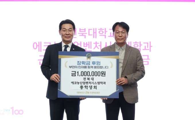 이와 함께 전북대학교 에코농산업벤처시스템학과 총학생회에서도 후배들의 학업 지원과 지역사회 환원에 힘을 보태기 위해 장학금 100만 원을 기탁하며 나눔에 동참했다.