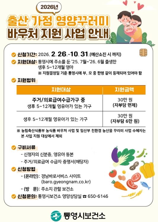 (포탈뉴스통신) 통영시는 영아의 건강한 성장·발달 도모 및 출산 가정의 경제적 부담을 완화하기 위해 2026년 신규사업으로 '출산 가정 영양꾸러미 바우처 지원사업'을 시행한다고 24일 밝혔다.