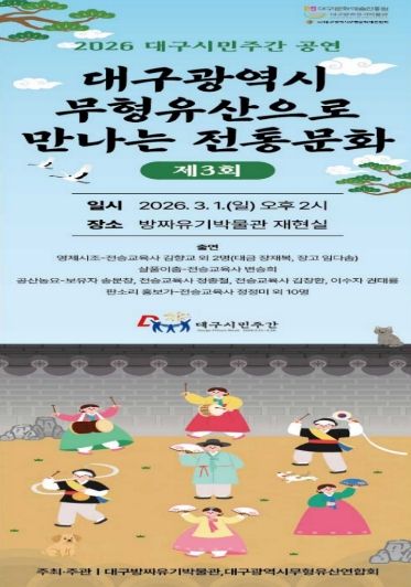 (포탈뉴스통신) 대구문화예술진흥원 박물관운영본부 소속 대구방짜유기박물관에서는 2026년 대구시민주간(2.21.~28.)을 맞아 3월 1일 오후 2시, 박물관 재현실에서 대구의 전통문화를 알리는 특별 공연 ‘대구광역시 무형유산으로 만나는 전통문화’를 개최한다.
