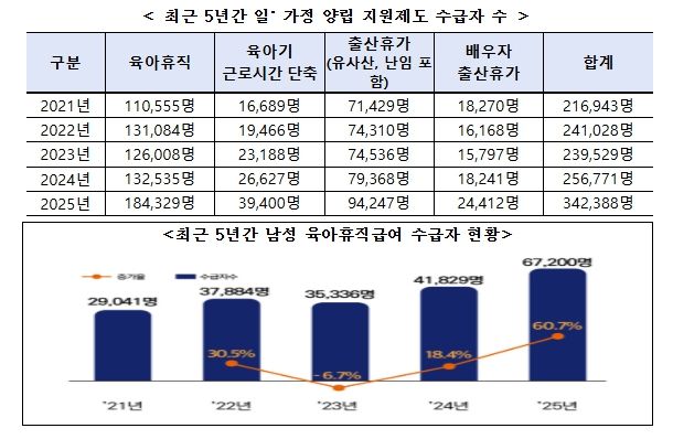 2025년 남성 육아휴직급여 수급자 수는 6만 7,200명으로 전체 수급자의 36.5%를 차지했다. 이는 전년 대비 60.7% 증가한 수치로 여성 증가율(29.1%)을 크게 웃돌았다. 육아휴직, 육아기 근로시간 단축, 출산휴가 등 일·가정 양립 지원제도 수급자 수는 34만 2,388명으로 집계됐다. 관련 통계 작성 이후 처음으로 30만 명을 넘어선 것으로 전년 대비 33.3% 증가해 최근 5년 중 가장 높은 증가율을 기록했다.