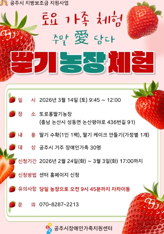 (포탈뉴스통신) 공주시 장애인가족지원센터는 관내에 거주하는 장애인 가족을 대상으로 토요 가족 체험 프로그램 ‘주말애(愛) 담다’를 운영하고, 딸기체험 참여자를 모집한다고 밝혔다.