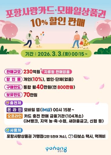(포탈뉴스통신) 포항시가 지역 경기 회복과 민생경제 안정을 위해 내달 3일부터 카드형·모바일 포항사랑상품권(포항사랑카드) 230억 원을 10% 할인된 금액으로 판매한다.